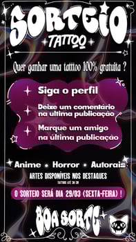 🎉 Sorteio de Tatuagem! 🎉 Estarei promovendo um sorteio exclusivo onde você pode ganhar uma tatuagem COMPLETAMENTE GRATUITA! Escolha entre estilos como Anime, Horror ou Artes Autorais e dê vida à sua pele com uma tattoo de até 30 cm ✨ Como Participar? Seguir é fácil, e ganhar é ainda mais! Apenas: ✨Siga nosso perfil no insta✨ Mantenha-se atualizado com nossos trabalhos mais recentes. . ✨Deixe um comentário no último post✨ Mostre seu entusiasmo e diga-nos qual estilo de tatuagem captura sua imaginação. . ✨Marque um amigo no último post✨ Aumente suas chances trazendo seus amigos para a diversão. Quanto mais amigos você marcar, maior será sua chance de ganhar! . ✨Participe agora e cruze os dedos!